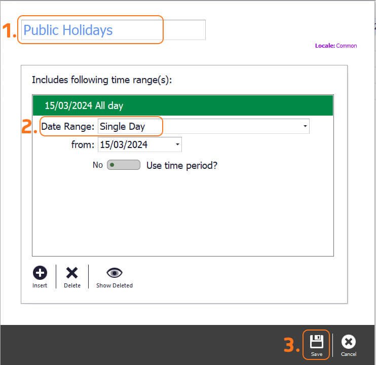 4. Add the name of the schedule, we'll use Public Holidays (1.), then for the Date Range, select Single Day (2.), and hit Save (3.).